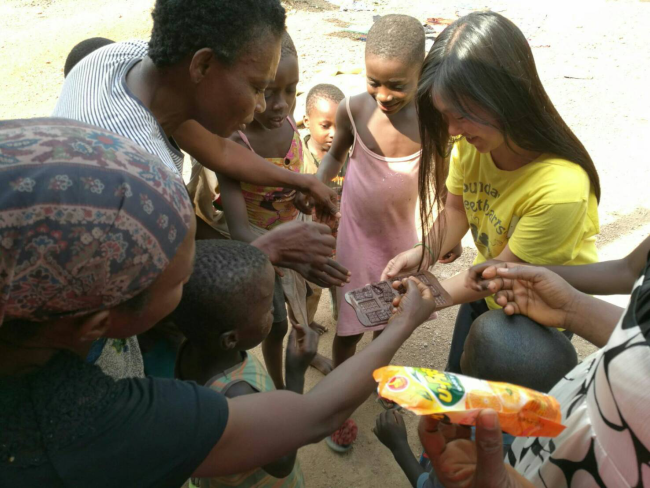 今回は少人数で行いました。焙煎したカカオ豆を積極的に剥いてくれたり、他に何かできることある〜?と興味津々でした。作ったチョコレートは子どもたちにも配りました。日本の子どもと同じく、ガーナの子どももチョコレートが好きみたいです。1分もしないでチョコレートはなくなりました!