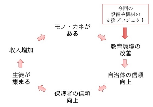 私が目の当たりにしたこの現状は、生徒の教育に悪いだけでなく、自治体の信頼を損ね、持続的な経営が立ちゆかなるリスクをはらんでいると考えました。そこで、今回思い切ってクラウドファンディングに挑戦し、幼稚園の教育環境を物資面から改善する支援を行うことに決めました。そうすることで、今の負の連鎖を断ち切り、ポジティブな循環を生むことで、より持続的な貧困層向けの幼稚園経営ができると考えています。