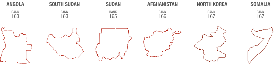 ワーストTOP10を見ると、その過半数がアフリカ諸国となっています。最下位は、海賊問題やイスラム過激派組織「アルシャバーブ」の脅威にさらされている”ソマリア“(166位/11点)が北朝鮮と同スコアで、昨年に引き続き最も腐敗が深刻な国となりました。またスーダン(165位/12点)、南スーダン(163位/15点)、アンゴラ(163位/15点)、リビア(161位/16点)など紛争が続いている国や、ガバナンスや司法が機能していないところなどがランクされています。