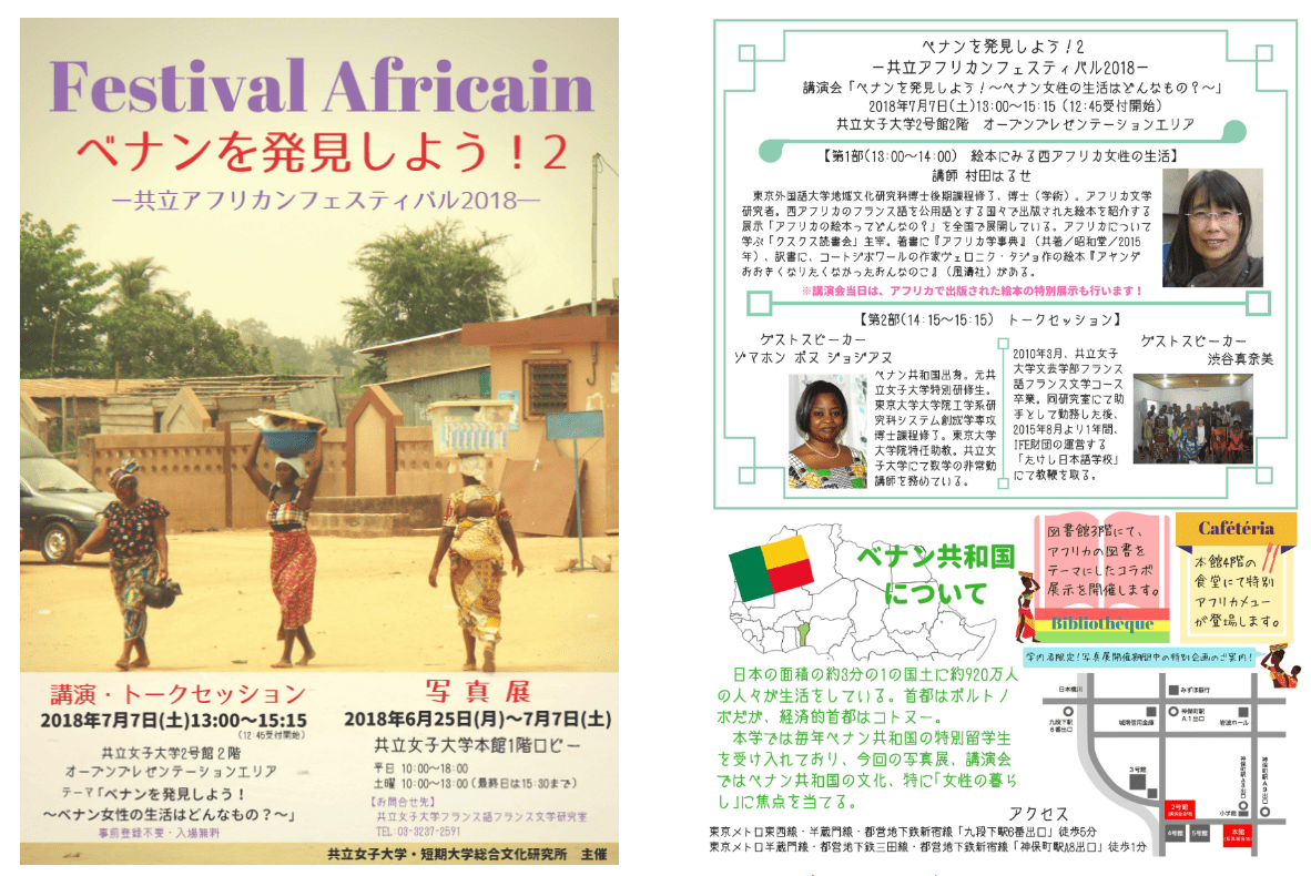 共立女子大学・共立女子短期大学 総合文化研究所では、独自の展示講演企画として、「ベナンを発見しよう!2 -共立アフリカンフェスティバル2018-」と題し、ベナン女性の暮らしに焦点を当てた写真展および公開講演会を開催する。