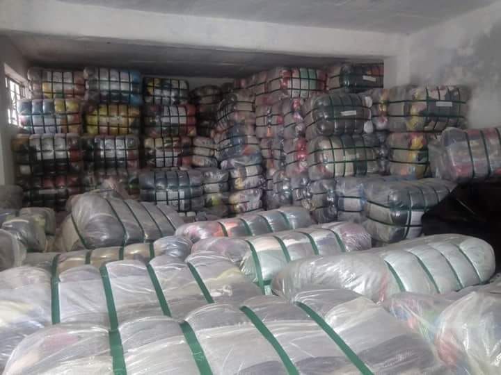 カマウさんの倉庫。グレードAやBの衣類が大量に保管されている。