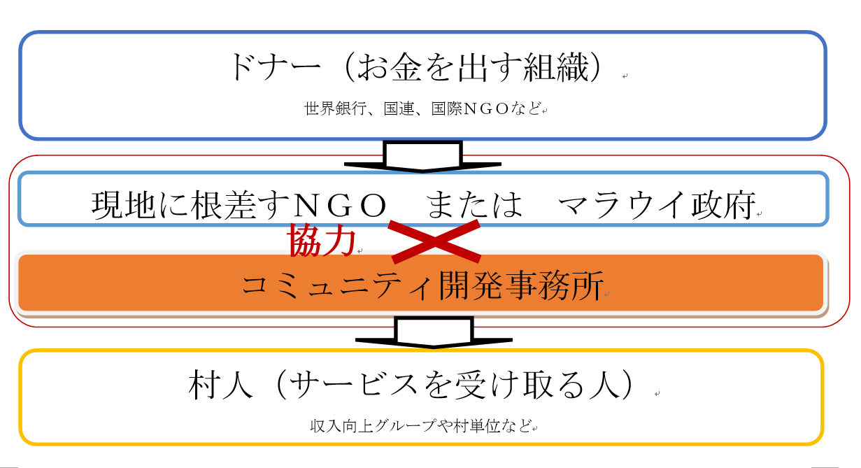 世界銀行などがドナーとしてお金を出資し、現地に密着するNGOまたはマラウイ政府がプロジェクト化します。