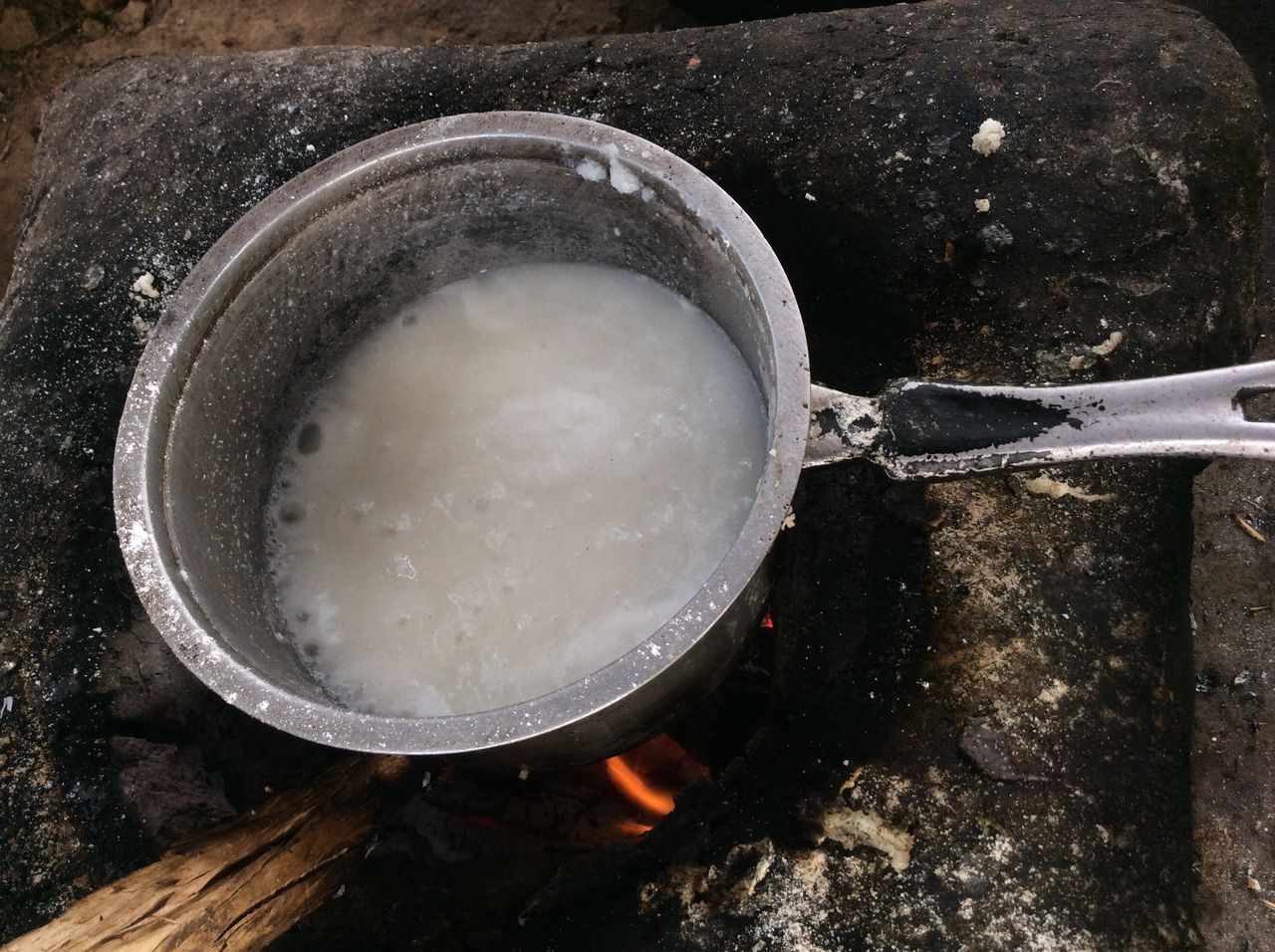 水が温まったら沸騰する前に、ウファと呼ばれるトウモロコシの粉を投入。